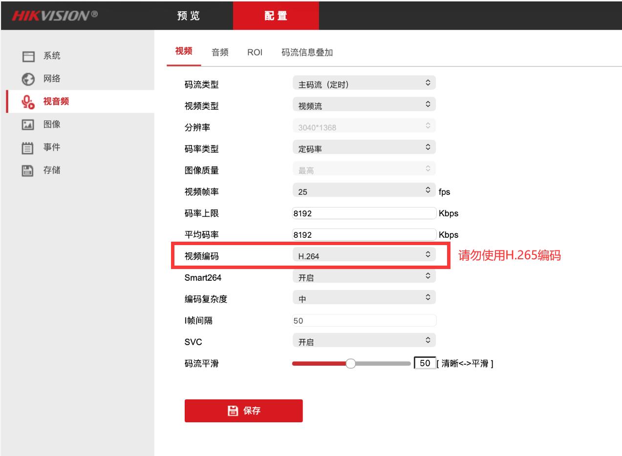 如果您使用的是海康威视的摄像头,请不要使用H265的视频编码;